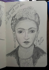 Last night I tried the famous face of Mexican artist Frida Kahlo. Frida had polio as a child and also suffered pain from a terrible injury in a bus crash at the age of 18, and also much emotional pain in her life. Many of her self portraits deal with this pain. You can read more about her by googling her or by following this link.